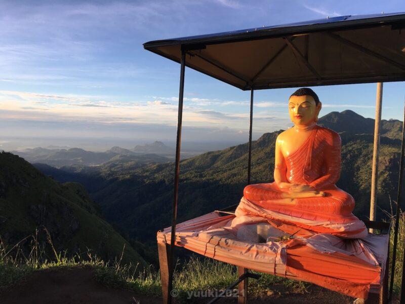 すぐに見晴らしのいい頂上に着いた。ちょうど太陽が山から顔を出すところで、壮大な風景と朝の清々しい光が気持ちよかった。山頂付近を歩き回ると、ド派手な仏像が目についた。日本だともっと厳粛な雰囲気を醸し出すと思うが、仏教に対する感覚もスリランカではかなり違うみたいだ。